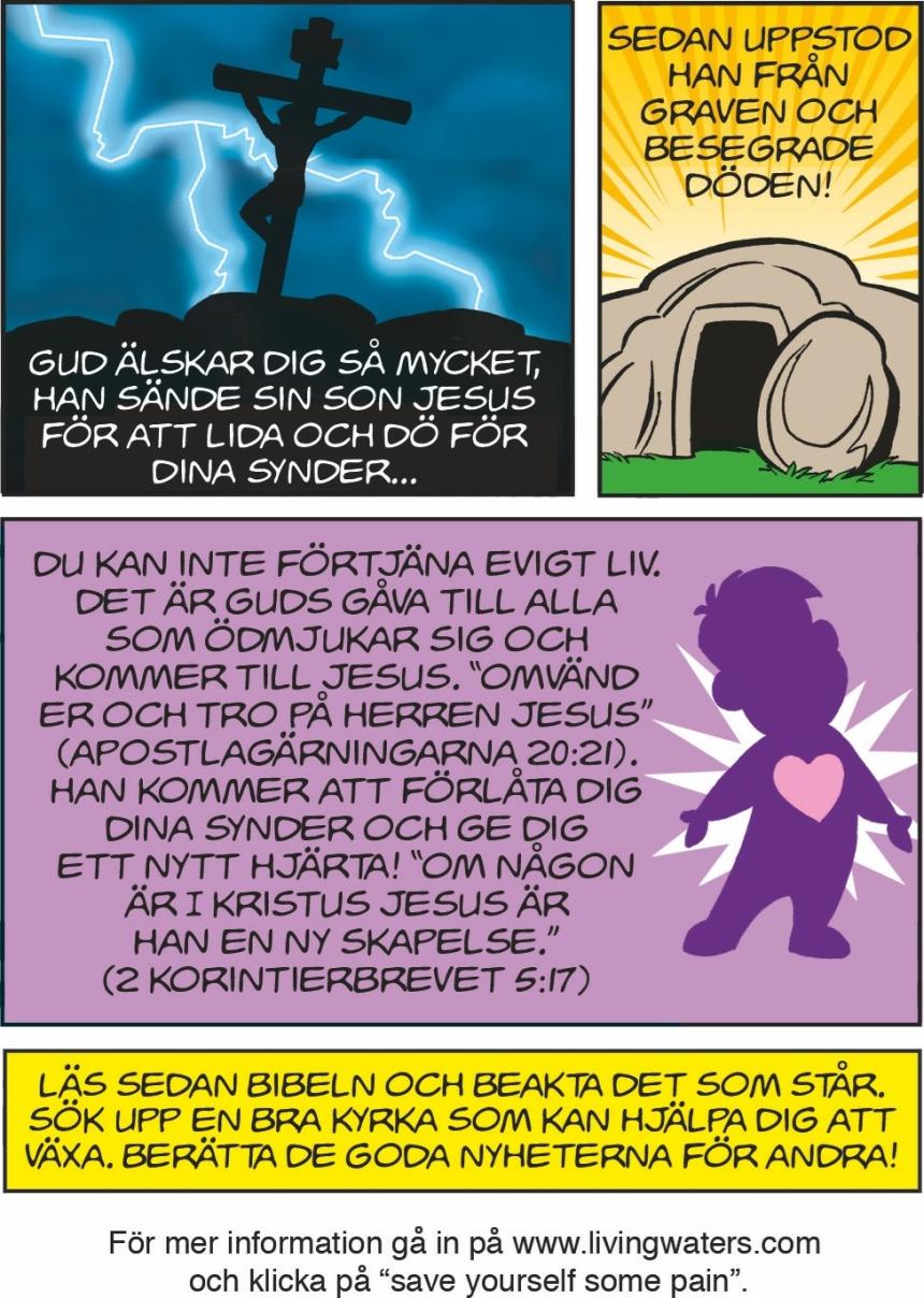 Jesus, jag tar nu emot dig och bekänner att du är Herren. Jag tror att Gud har uppväckt dig från de döda. Tack att jag nu är frälst och har fått evigt liv. Amen.
